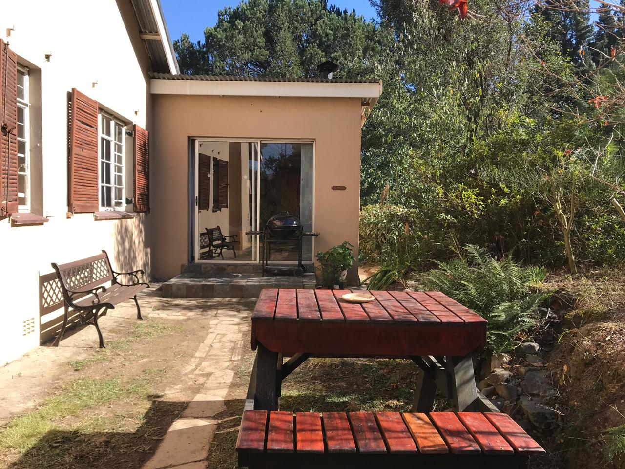 The Monkey Hide comfortably accommodates a couple in an open-plan wing set back from the Main Lodge at Ashfield-on-Hogsback. The lounge area is centred around the log fireplace. It has a kitchenette and en-suite (shower) bathroom.